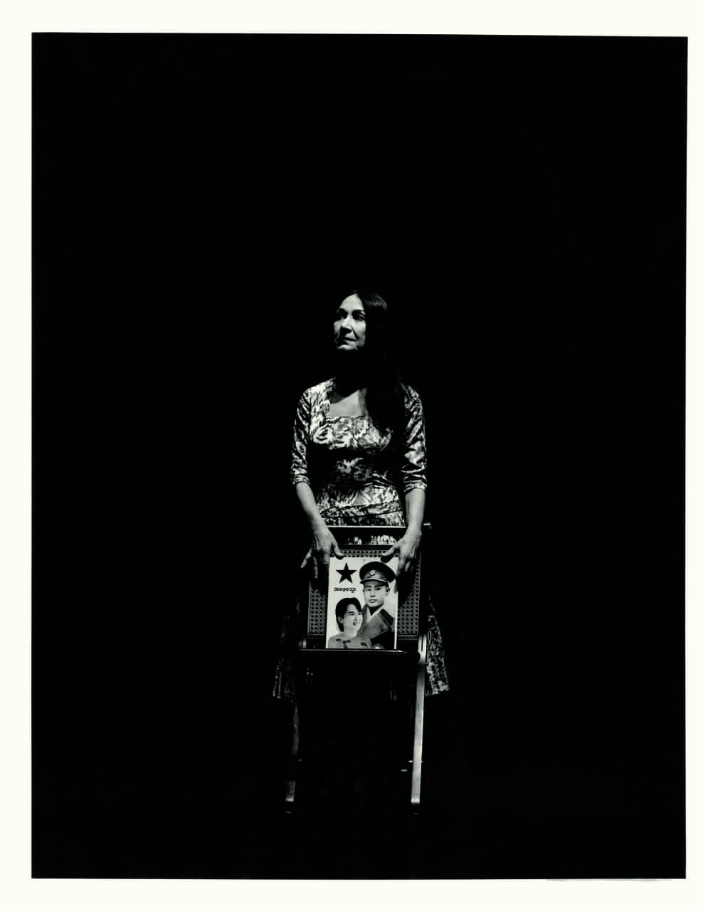 Una sfida a cogliere l’Ermanna nascosta, la violenza celata sotto la dolcezza appunto, la potenza selvatica e solitaria. Ma in Vita agli arresti di Aung San Suu Kyi Fedrigoli non può riferirsi solo all’attrice, deve fare i conti con una donna altrettanto reale e per di più famosa, sicché le foto partono da un sentimento profondo di rispetto per la doppia identità del soggetto da fotografare. Si relaziona dunque alle modalità controllate e aggraziate con le quali questa figura pubblica si è imposta all’attenzione mondiale, ma pur sempre di foto col banco ottico si tratta. La mostrano raccolta in sé, piccola nel grande spazio della Storia; il suo corpo sfuma e si moltiplica quando viene fissato in contrapposizione con i militari dai fucili puntati, nell’avanzare simbolicamente si moltiplica; qualcosa può sorprendere nella mano che regge il ritratto del padre, quando le dita sembrano ingrossarsi uscendo dal polso sottile [fig. 2]. E poi ci sono i momenti privati in cui l’attrice è più libera e dunque anche il fotografo: ecco allora il suo volto dominato dall’inquietudine mentre si rivolge a un geco in un dialogo intimo con se stessa o la scena sconvolgente del dolore per la morte del marito [fig. 3]. Ma i contorni tengono e resta influente l’immagine della vera Aung San Suu Kyi: l’acconciatura dei capelli con i fiori, l’eleganza degli abiti, la forza gentile.
