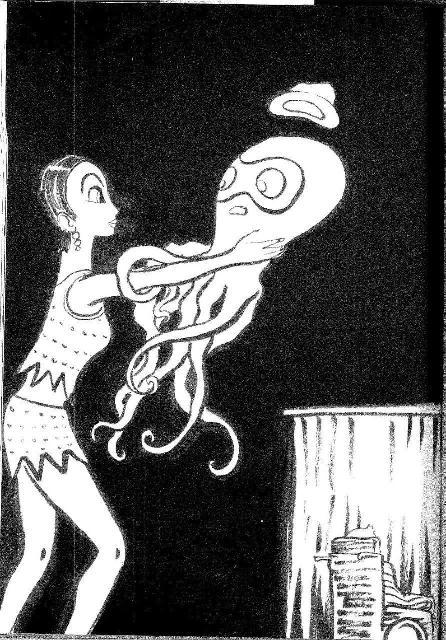 Procedendo al ritmo dell’immaginazione di Spirit, talvolta il fumetto di Dalisi giustappone nella stessa tavola passato e presente, realtà e pensiero. Il racconto visivo assume allora tratti onirici: eventi che hanno portata esclusivamente metaforica o che si riferiscono alla sola immaginazione dei personaggi sono rappresentati concretamente. La lettera s’incarna in luogo del referente alluso. Quando Spirit precipita nel Darro, cadendo nel tranello di Moira Mori e Saro Buono, Dalisi non esita a disegnarlo come se fosse incappato in una vera trappola: una falla nel pavimento dissimulata da una tappeto.[58] Un’immagine che è la variazione di un’altra vignetta nella quale Spirit è rappresentato letteralmente intrappolato nella metaforica «tela di ragno»[59] dei suoi antagonisti.[60] Qualcosa di simile accade per la signorina Sgàrberi, «infermiera professionale […] regolarmente stipendiata per le cure mediche di cui abbisognava» il dottor Mori, padre di Moira: nelle vignette che la ospitano il dettaglio grottesco della sua capigliatura è eluso: «chissà poi, sotto quella cuffietta, da quanto tempo non si faceva uno shampoo». Dalisi preferisce rappresentarla, invece, materializzando l’insulto rivoltole da Spirit («quella scopa»),[61] con i capelli, quindi, in un’improbabile acconciatura che ignora le leggi di gravità.[62] Lo stesso Spirit non sfugge alla metamorfosi imposta dall’interpretazione letterale, e per questo parodica, operata da Dalisi. È possibile ritrovarlo, perciò, miniaturizzato in piedi nel palmo della mano di Moira,[63] come a voler dire che la ragazza lo aveva in pugno, oppure nelle sembianze di un polpo consegnato dalla stessa al padre psicanalista.[64]