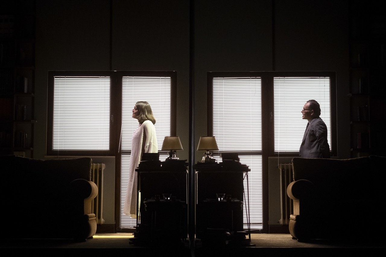 La simmetria diventa così dispositivo drammaturgico che materializza la dinamica di specchio e di transfert tra i due personaggi in scena. Il tempo dell’azione è un ‘presente continuo’, sospeso fra realtà, sogno e ricordo.[20] La regia di Martone enfatizza questa sospensione, evitando un’ambientazione naturalistica in favore di un’atmosfera onirica, fatta di luci soffuse, movimenti lenti, dialoghi spezzati. Il risultato è una partitura scenica che trasforma la psicoanalisi in rito teatrale, e il dialogo terapeutico in dramma esistenziale.